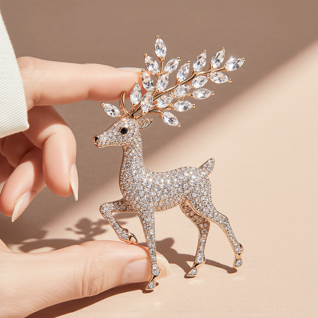 A graceful reindeer brooch adorned with marquise-cut lab-grown diamonds as antlers and a sparkling diamond-studded body. Perfect for sarees or formal wear, it beautifully blends nature’s charm with timeless elegance.
